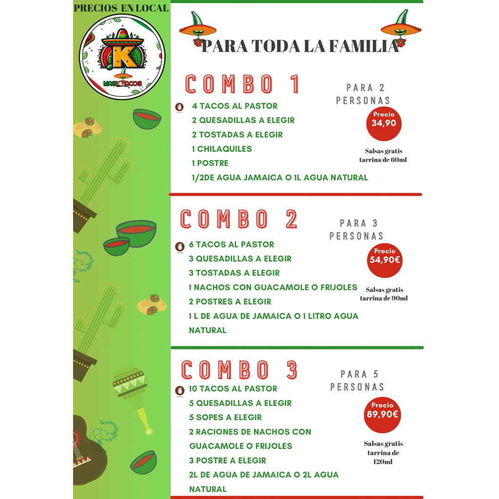 6 tacos al pastor , 3 quesadillas a elegir, 3 tostadas o 3 sopes a elegir, Nachos con queso, 2 postre , 1L Agua de Sabores o 1L de agua Natural