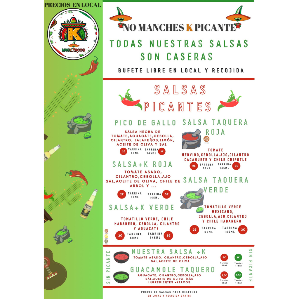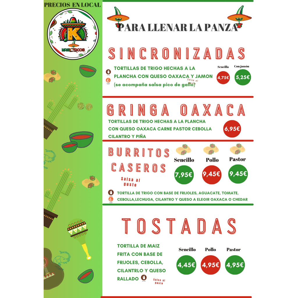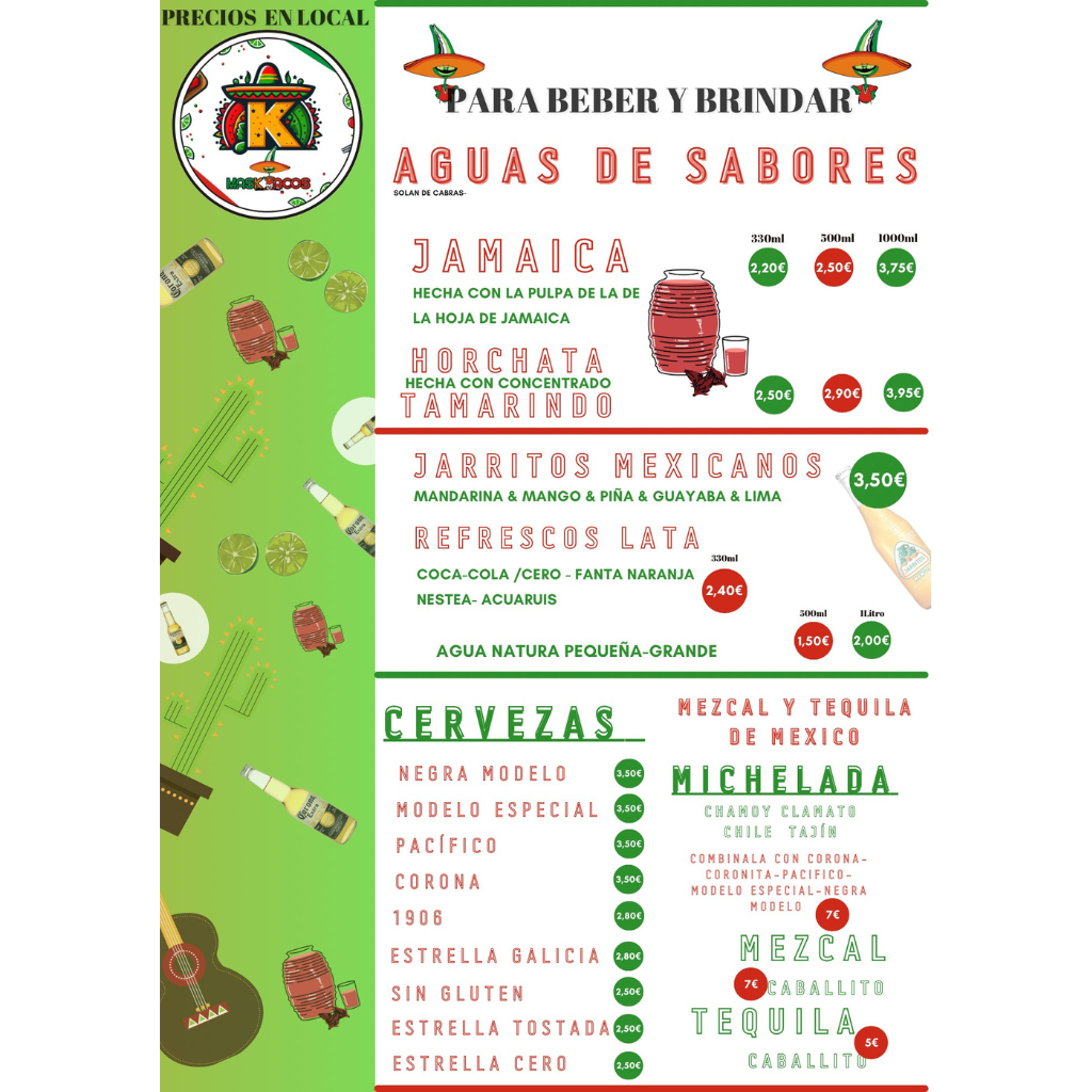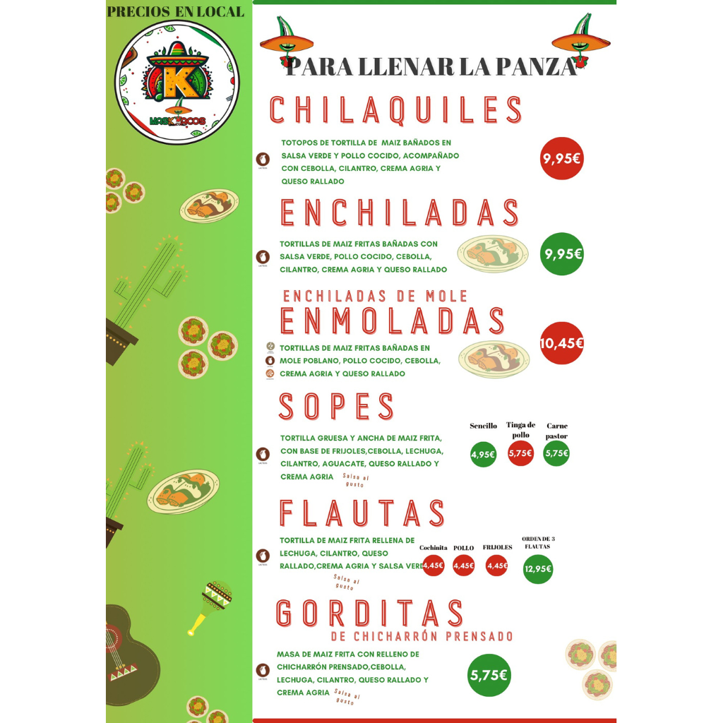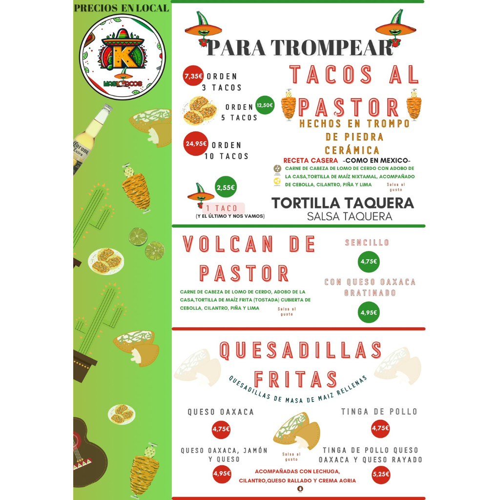 10 tacos al pastor , 5 quesadillas a elegir, 5 sopes a elegir, 2 raciones de Nachos , 3 postres , 2L Agua de Sabores , 2L de agua natural
